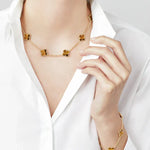 The Clover Collection Bracelet is a timeless piece featuring a delicate triple-symbol design, perfect for adding a subtle yet elegant touch to your wrist. Designed to catch every eye, it completes your look with effortless style. Crafted from high-quality stainless steel plated with 18-karat gold, our bracelets are nickel-free, hypoallergenic, and water-resistant—ensuring you can wear them all day, every day, with confidence and comfort.